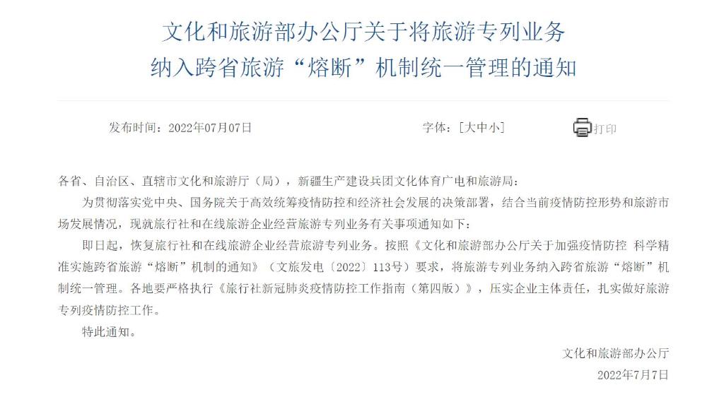 文化(huà)和旅遊部辦公(gōng)廳(tīng)7月7日發布通知要求,即日起,恢複旅行社和在線旅遊企業(yè)經營旅遊專列業務;按(àn)照相關(guān)規定,將旅遊專列(liè)業務納入跨省旅遊“熔斷”機製統一管理。